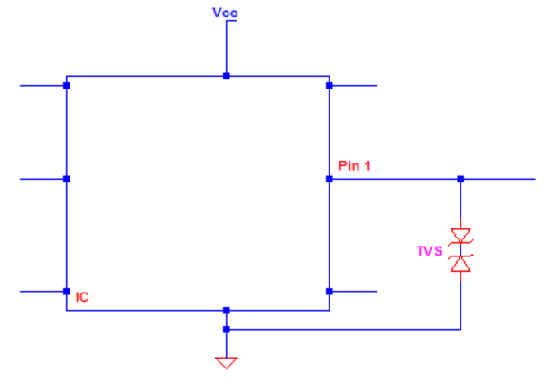 IC引腳旁邊的單向TVS。在電路正常運(yùn)行時(shí),TVS 不導(dǎo)通。當(dāng)有正尖峰時(shí),電壓會(huì)被鉗位。當(dāng)出現(xiàn)負(fù)尖峰時(shí),TVS將正向偏置并將尖峰轉(zhuǎn)向GND。